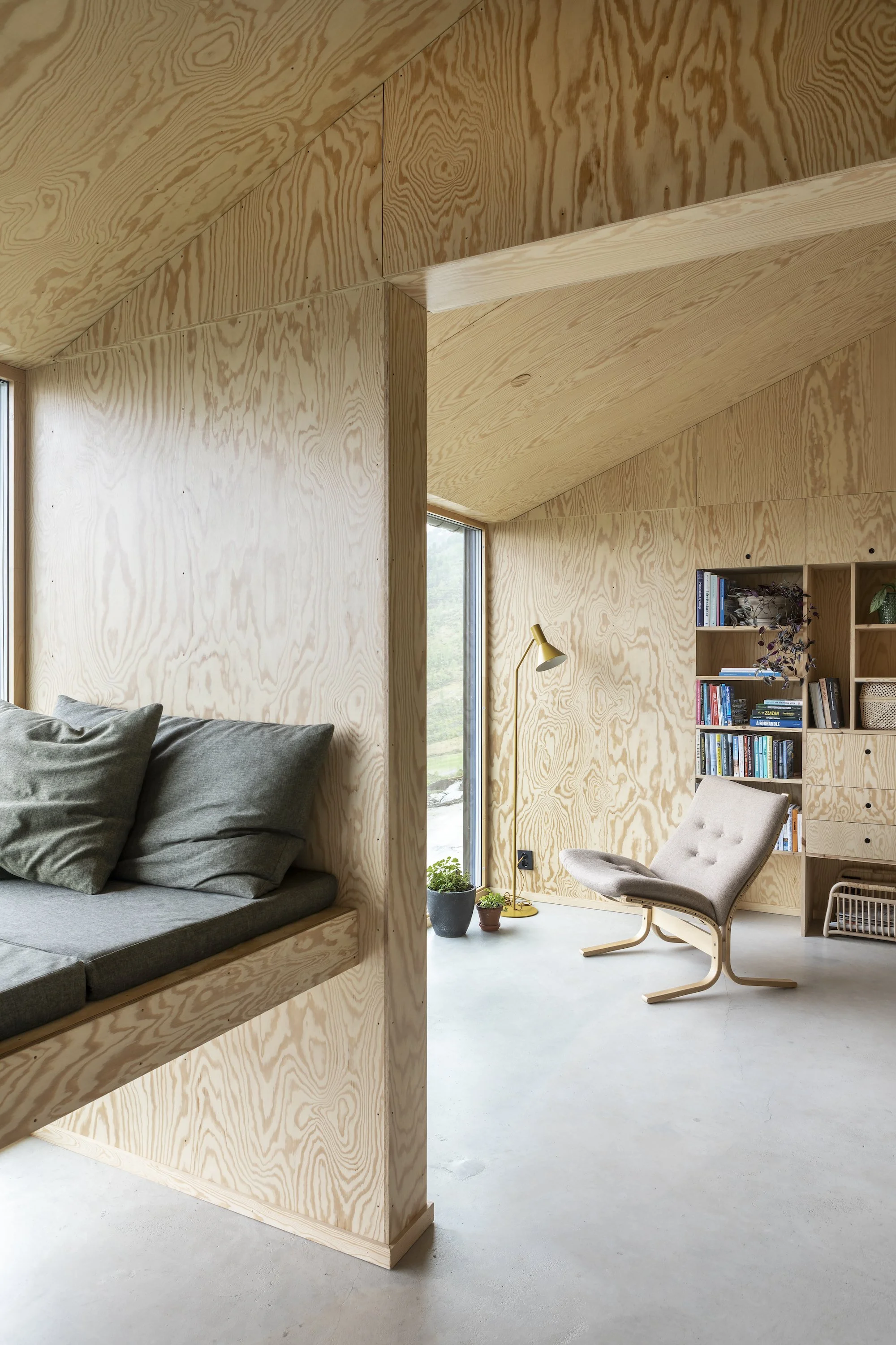 2016. Single family house built into a small ridge, in spectacular Fjærland, Sogn og Fjordane. The house has a rectangular shape with a carefully planed interior and placing of windows, giving view to Supphellebreen and the mountains around. The roof and the floor inside, following the inclination of the hill. Lowtech ventilation system and a massive wood construction with a concrete core with bathrooms.